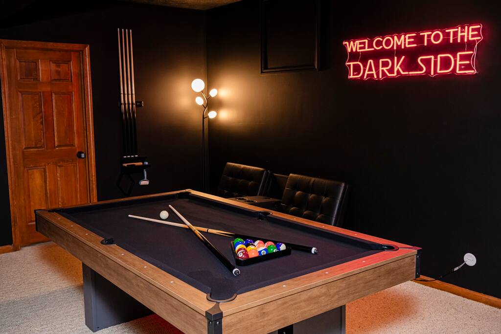 GREAT ROOM: -Spacious and cozy seating area -Unique and luxurious feel -65in Roku TV -Beautiful natural lighting DINING ROOM: -Spacious dining area that can be a multi purpose space with two tables and extra chairs available -Beautiful two toned wall with wooden trim molding -6 amazing photos of various landscapes throughout Indianapolis KITCHEN: -Fully stocked kitchen with cookware and bakeware -Plenty of pantry space for longer stays -Fully stocked coffee bar for guests to enjoy; includes coffee pot & Keurig -Kitchen essentials provided - dish soap, dishwasher pods, sponges, trash bags, cooking oil, salt, pepper LIVING ROOM: -Extremely comfortable and cozy sofa to enjoy while watching TV or movies -One of a kind custom "Indianapolis" mural with elements that cover the entire city -Spacious, cozy, and plenty of natural lighting -Popcorn bar complete with popcorn machine and flavors to enjoy! BEDROOM ONE: -This one takes you directly to the heart of Indianapolis with elements of one of the most beautiful stadiums in the country! -Full size, super comfortable King bed -Trundle/Daybed with two very comfortable mattresses -Cozy linens -Full length mirror -55in Roku TV BEDROOM TWO: -The "Geist" Room: Bringing in vibrant elements from the nearby Geist Reservoir, you'll feel emerged! -Very comfortable king size bed and cozy linens -Full length mirror -50in Roku TV BEDROOM THREE: -The "Indy 500" Room: A unique and stylish take on Indianapolis' most notorious sporting event -Spacious with king size, comfortable bed with ultra-soft linens -Full length mirror -50in Roku TV BEDROOM FOUR: -Cutting right in to what often brings life to Indy's sports fandom with a subtle nod at the city's premier basketball club -- The "Pacers" Room -Comfortable Queen bed -Spacious closet -Full length mirror -50in Roku TV BASEMENT: -This basement is a TOTAL vibe -Fun neon lighting to compliment the dark feel of the game room -Pool table -4 arcade games -Skee ball game -Foosball -Hightop table, perfect for enjoying a drink together or playing cards -75in Roku TV -Queen sleeper sofa; linens available in laundry room closet BATHROOM ONE: -En suite in the primary bedroom on the second floor -Beautiful marble tile -Jacuzzi tub (with jets) and walk in shower -Spacious vanities -Towels available -Shampoo, soap, lotion, and conditioner included BATHROOM TWO -Full bathroom on the second floor -Shower/tub combo -Spacious double sink vanity -Towels available -Shampoo, soap, lotion, and conditioner included BATHROOM THREE -Full bathroom on the main floor -- great for guests with physical restrictions -Spacious Shower -Single sink vanity -Towels available -Shampoo, soap, lotion, and conditioner included HALF BATH -Half bath located in the basement GARAGE: -Ping Pong table -Indoor basketball game -Darts -Cornhole DRIVEWAY/PARKING: -Can fit up to 6-7 cars comfortably (no overnight street parking) -Basketball hoop (basketball available) *No buses, RVs, trailers, or similar recreational vehicles allowed on property. Any branded vehicles must be covered up.* *We also have a queen air mattress AND a foldable bed (located in the laundry room) for guests to use when needed. Linens can be located in the laundry room cabinets.