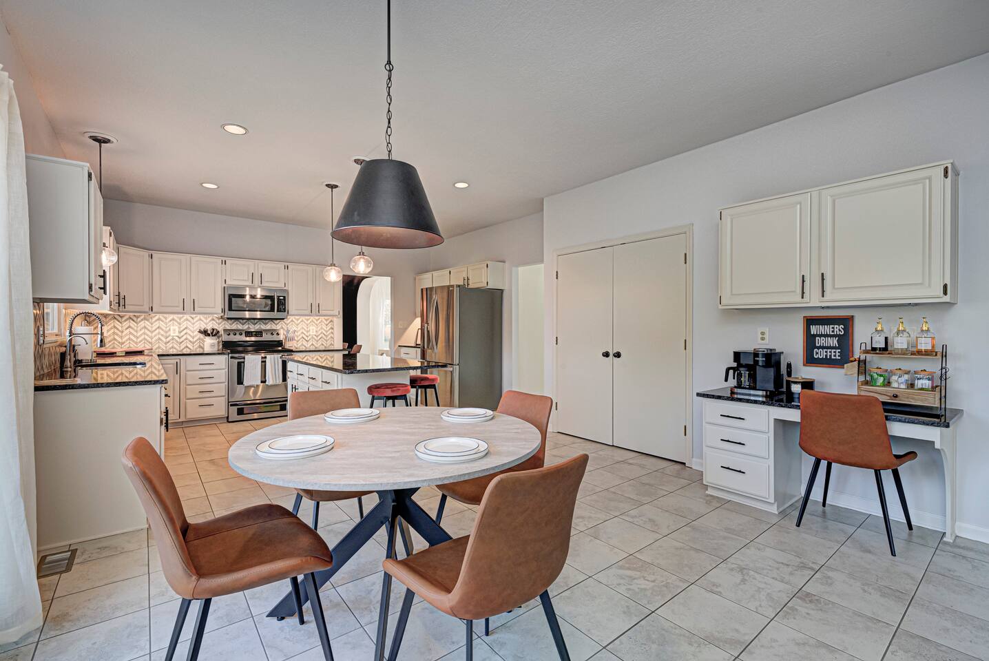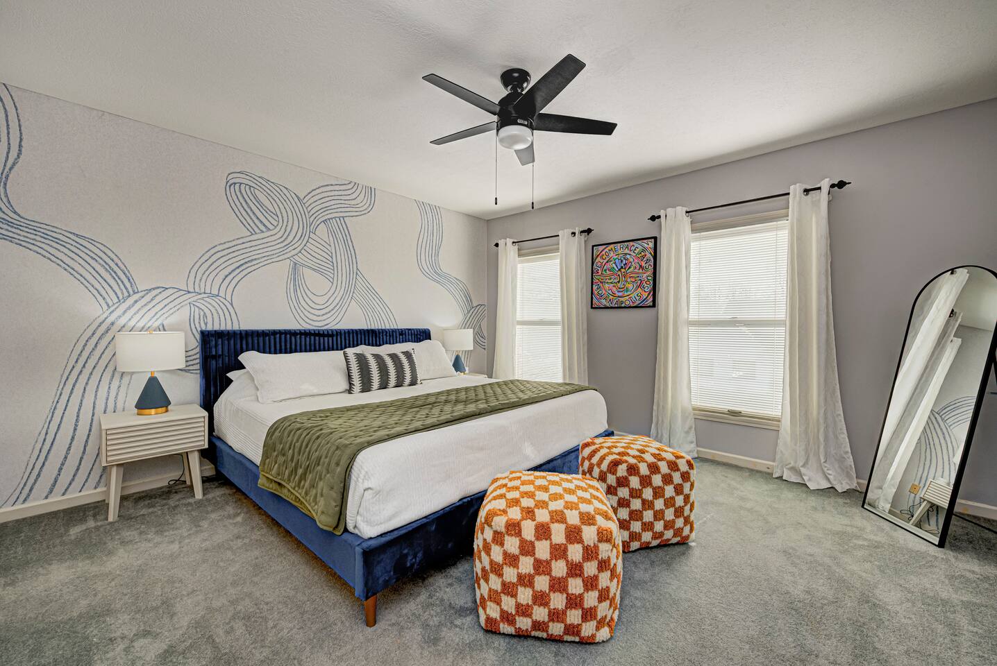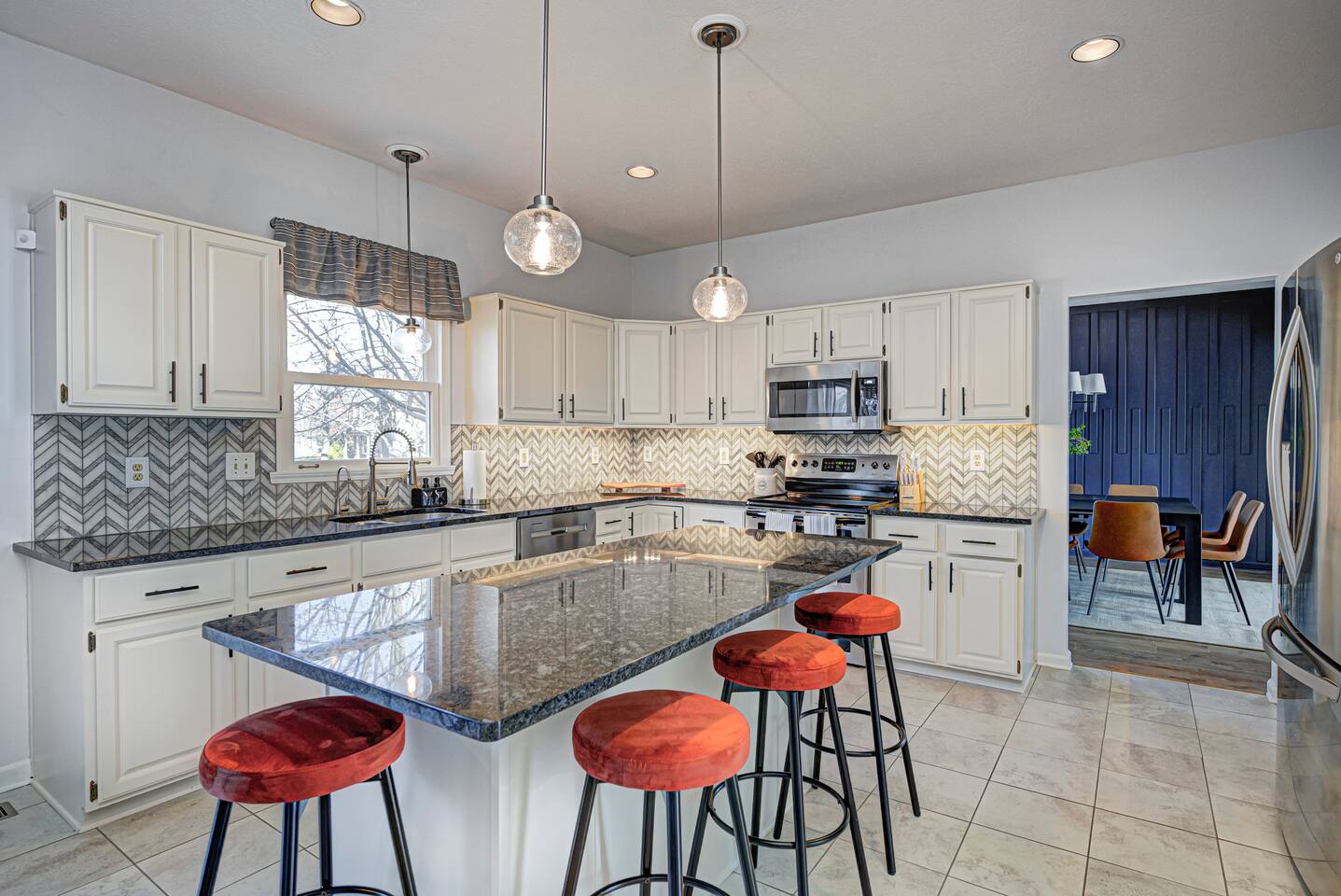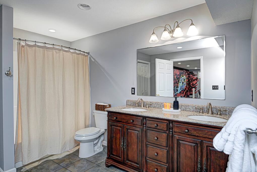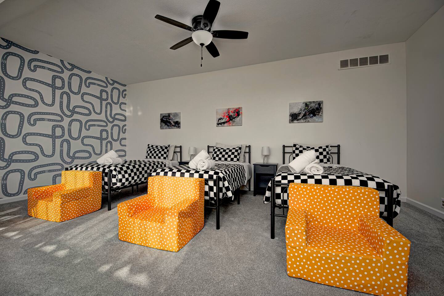 FRONT LIVING ROOM: -Spacious sitting area -”Back Home Again” custom mural with Indianapolis cityscape -70in Roku TV -Indy 500 Memorabilia throughout -Beautiful natural lighting DINING ROOM: -Spacious dining area that can be a multi purpose space with two tables and extra chairs available -Beautiful accent wall and race themed artwork KITCHEN: -Fully stocked kitchen with cookware and bakeware -Plenty of pantry space for longer stays -Fully stocked coffee bar for guests to enjoy; includes coffee pot & Keurig -Kitchen essentials provided - dish soap, dishwasher pods, sponges, trash bags, cooking oil, salt, pepper SECOND LIVING ROOM: -Comfortable sofas to enjoy while playing games -Pagoda at Indianapolis Motor Speedway custom mural -Spacious, cozy, and plenty of natural lighting -Beautiful view of the spacious backyard OFFICE: -Transitional space that’s perfect for getting ready, working, or lounging -Queen sleeper sofa; linens available in laundry room closet -Checkered wall accent with stylish velvet chairs BEDROOM ONE: -Full size, super comfortable bed -Cozy linens -70 in Roku TV BEDROOM TWO: -Three twin size, super comfortable beds -Awesome space for kids with activity table and toys -Fun race theme throughout BEDROOM THREE: -Spacious with king size, comfortable bed with ultra-soft linens -Huge walk in closet -En suite bathroom with jacuzzi tub and walk in shower -70in Roku TV BEDROOM FOUR: -Comfortable king bed -VIbrant, elegant decor -Spacious closet -Full length mirror -70in Roku TV BEDROOM FIVE: -Comfortable king bed -Timeless, historic decor featuring Indianapolis Motor Speedway -Spacious closet -Full length mirror -70in Roku TV BASEMENT: -This basement is a VIBE -Custom race car mural crossing the line of bricks -Pool table and projector screen so that you can play and watch your favorites -Surround sound -Popcorn bar complete with popcorn machine -Milkshake bar with toppings for guests -Hightop tables perfect for enjoying a drink together or playing cards -Arcade room with three different consoles and a 70in Roku TV BATHROOM ONE: -En suite in the primary bedroom on the second floor -Jacuzzi tub and walk in shower -Spacious vanities -Towels available -Shampoo, soap, lotion, and conditioner included BATHROOM TWO -Full bathroom on the second floor -Shower/tub combo -Spacious double sink vanity -Towels available -Shampoo, soap, lotion, and conditioner included BATHROOM THREE -Full bathroom in the basement -Shower/tub combo -Spacious double sink vanity -Towels available -Shampoo, soap, lotion, and conditioner included HALF BATH -Half bath located on main level of home off the kitchen GARAGE/PARKING: -Two car garage that guests will have access to and driveway that fits 4 normal sized vehicles. (No overnight street parking) *No buses, RVs, trailers, or similar vehicles allowed on property. Any branded vehicles must be covered up.* *We also have a queen air mattress for guests to use when needed. Linens can be located in the laundry room closet.