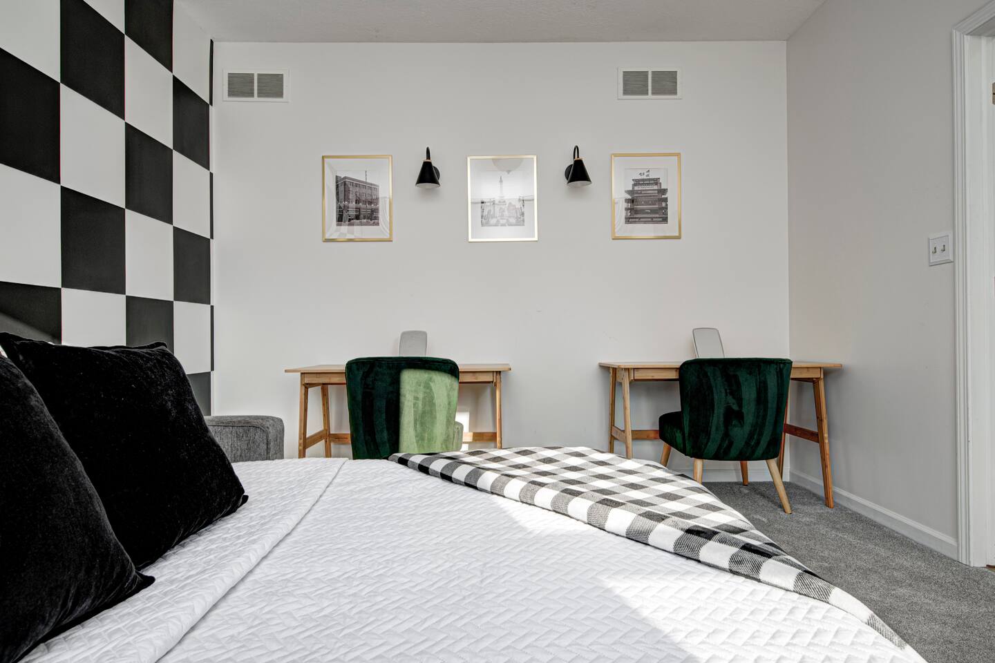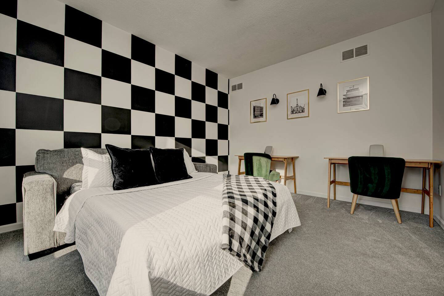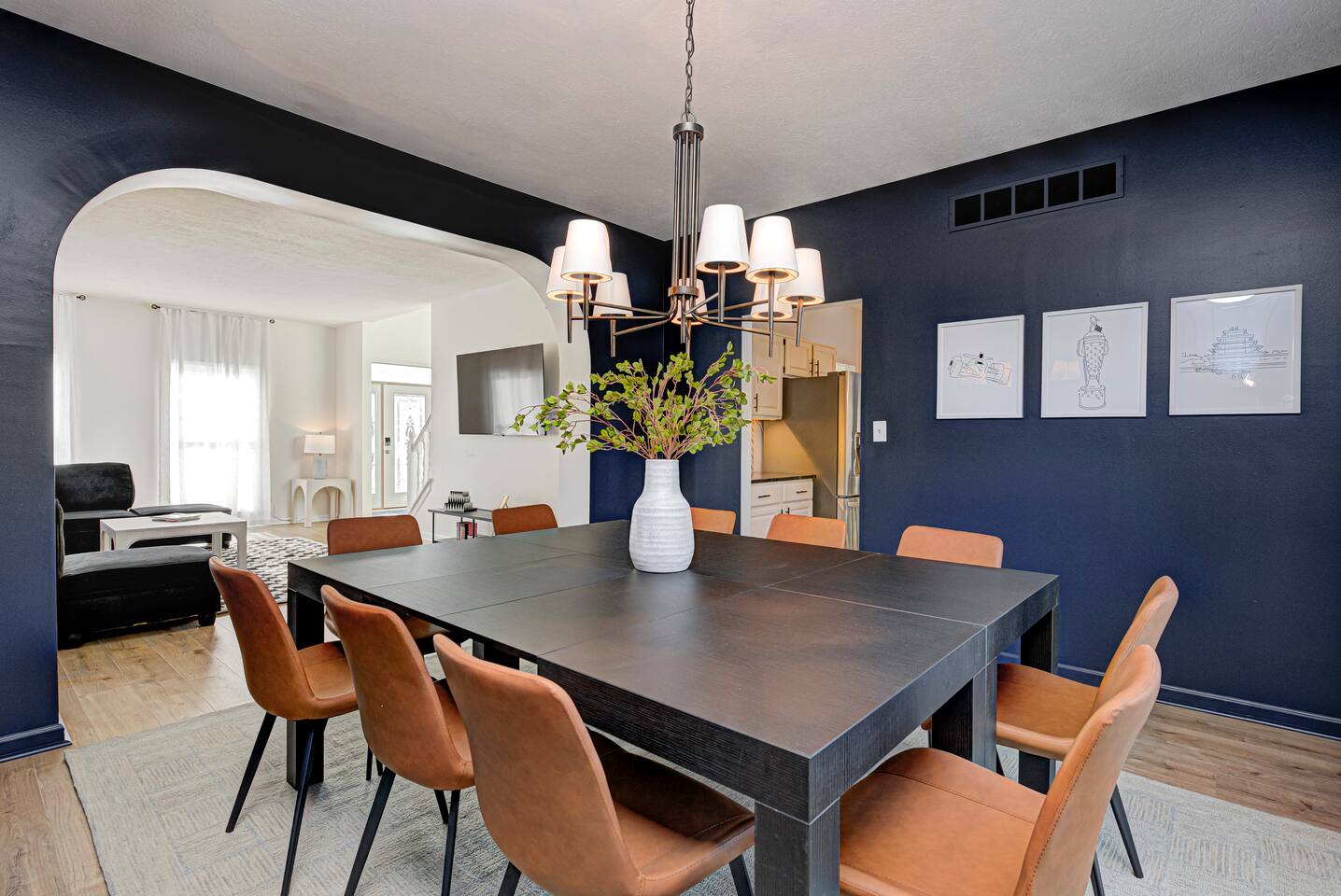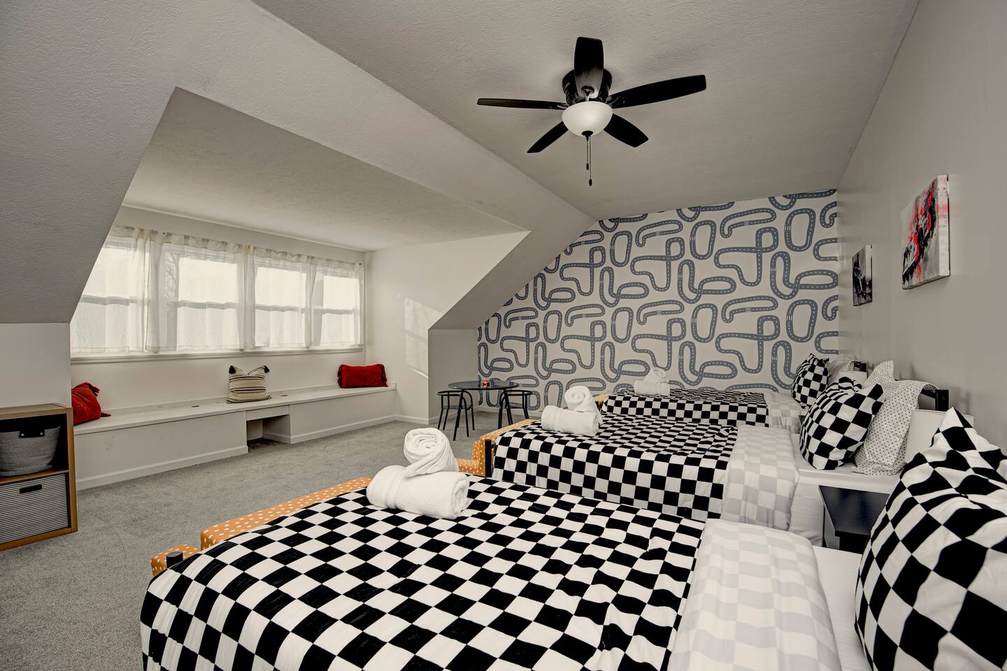 FRONT LIVING ROOM: -Spacious sitting area -”Back Home Again” custom mural with Indianapolis cityscape -70in Roku TV -Indy 500 Memorabilia throughout -Beautiful natural lighting DINING ROOM: -Spacious dining area that can be a multi purpose space with two tables and extra chairs available -Beautiful accent wall and race themed artwork KITCHEN: -Fully stocked kitchen with cookware and bakeware -Plenty of pantry space for longer stays -Fully stocked coffee bar for guests to enjoy; includes coffee pot & Keurig -Kitchen essentials provided - dish soap, dishwasher pods, sponges, trash bags, cooking oil, salt, pepper SECOND LIVING ROOM: -Comfortable sofas to enjoy while playing games -Pagoda at Indianapolis Motor Speedway custom mural -Spacious, cozy, and plenty of natural lighting -Beautiful view of the spacious backyard OFFICE: -Transitional space that’s perfect for getting ready, working, or lounging -Queen sleeper sofa; linens available in laundry room closet -Checkered wall accent with stylish velvet chairs BEDROOM ONE: -Full size, super comfortable bed -Cozy linens -70 in Roku TV BEDROOM TWO: -Three twin size, super comfortable beds -Awesome space for kids with activity table and toys -Fun race theme throughout BEDROOM THREE: -Spacious with king size, comfortable bed with ultra-soft linens -Huge walk in closet -En suite bathroom with jacuzzi tub and walk in shower -70in Roku TV BEDROOM FOUR: -Comfortable king bed -VIbrant, elegant decor -Spacious closet -Full length mirror -70in Roku TV BEDROOM FIVE: -Comfortable king bed -Timeless, historic decor featuring Indianapolis Motor Speedway -Spacious closet -Full length mirror -70in Roku TV BASEMENT: -This basement is a VIBE -Custom race car mural crossing the line of bricks -Pool table and projector screen so that you can play and watch your favorites -Surround sound -Popcorn bar complete with popcorn machine -Milkshake bar with toppings for guests -Hightop tables perfect for enjoying a drink together or playing cards -Arcade room with three different consoles and a 70in Roku TV BATHROOM ONE: -En suite in the primary bedroom on the second floor -Jacuzzi tub and walk in shower -Spacious vanities -Towels available -Shampoo, soap, lotion, and conditioner included BATHROOM TWO -Full bathroom on the second floor -Shower/tub combo -Spacious double sink vanity -Towels available -Shampoo, soap, lotion, and conditioner included BATHROOM THREE -Full bathroom in the basement -Shower/tub combo -Spacious double sink vanity -Towels available -Shampoo, soap, lotion, and conditioner included HALF BATH -Half bath located on main level of home off the kitchen GARAGE/PARKING: -Two car garage that guests will have access to and driveway that fits 4 normal sized vehicles. (No overnight street parking) *No buses, RVs, trailers, or similar vehicles allowed on property. Any branded vehicles must be covered up.* *We also have a queen air mattress for guests to use when needed. Linens can be located in the laundry room closet.