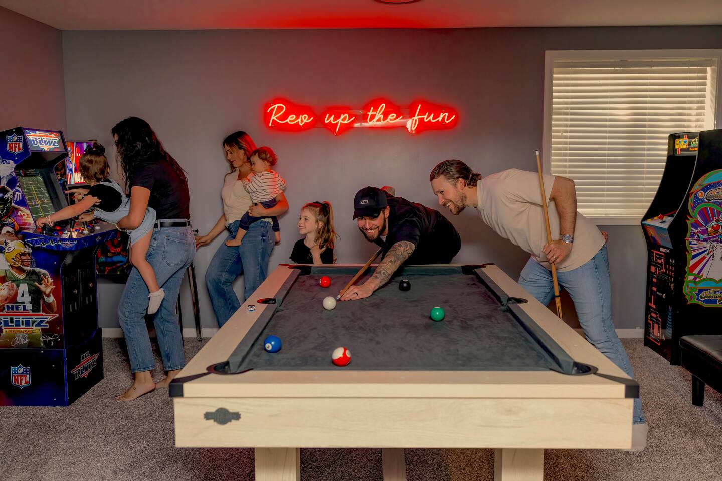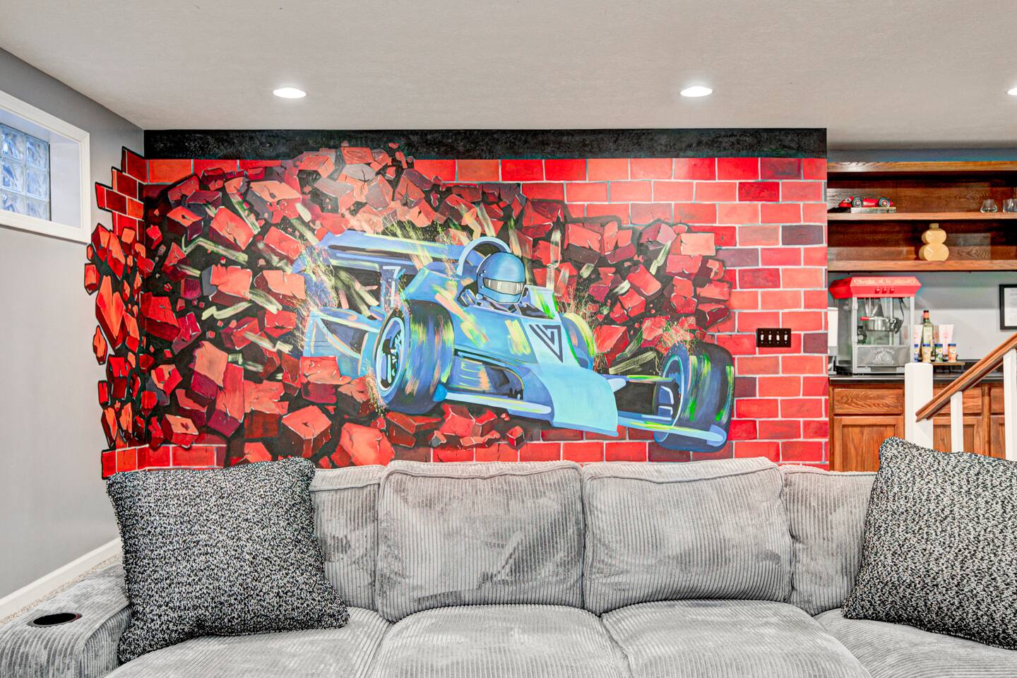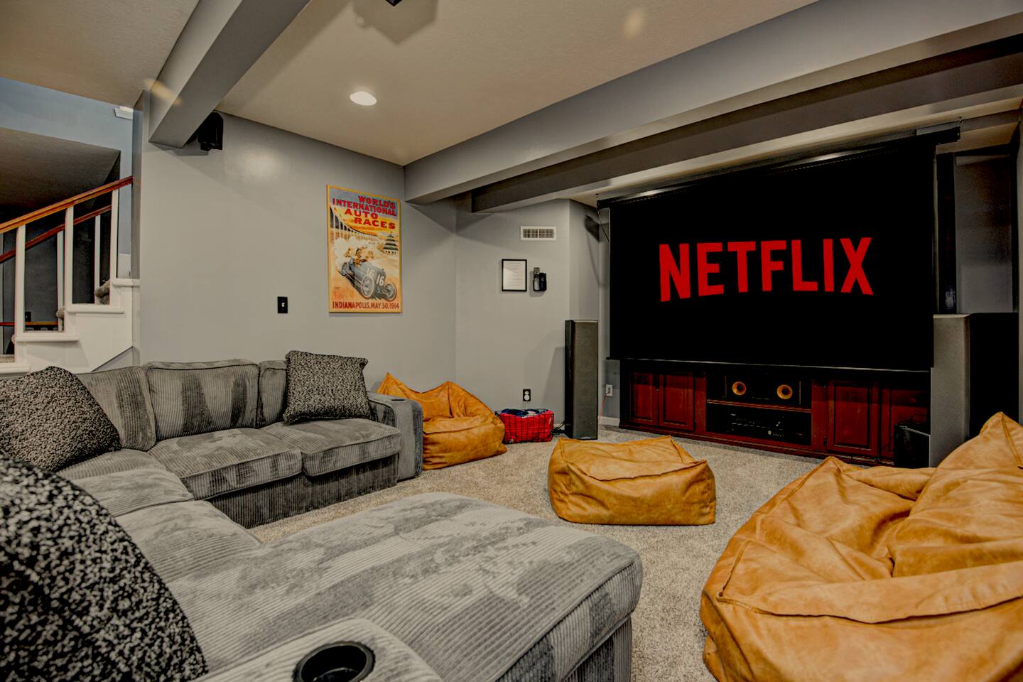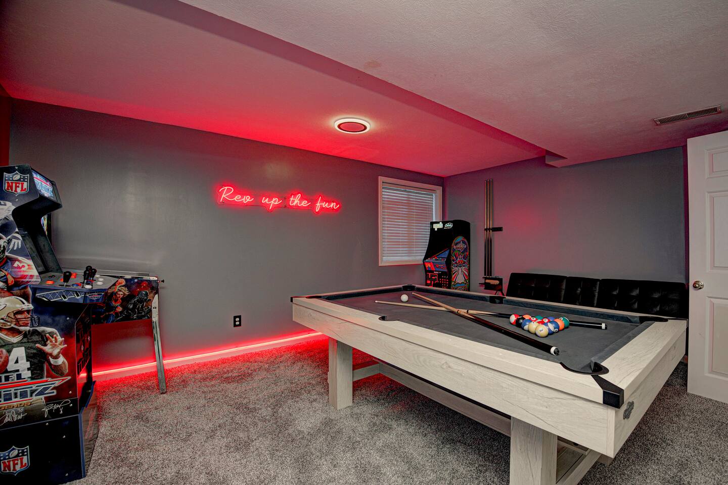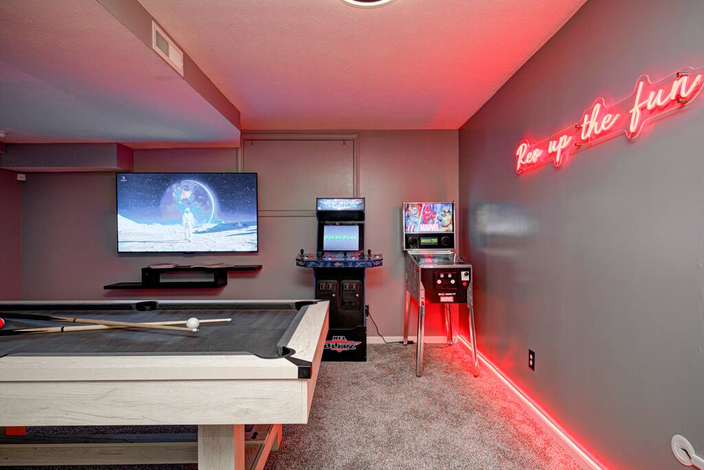 Welcome to Victory Lane! Amenities: 🎮 Game room w/ NFL Blitz, Pac-Man & Pinball 🎱 Pool table for friendly competition 🎬 Private movie room w/ surround sound 🥤🍿 Milkshake & popcorn bar—fun for all ages ☕️ Coffee bar fully stocked for your morning fix 🍽️ Backyard deck w/ outdoor dining & chill vibes 🎨 Custom murals that wow every guest 📺 Spacious living room w/ oversized TV Location: 📍 25 min to downtown Indy 🏁 30 min to the Motor Speedway 📘 Guidebook w/ our top local picks included!